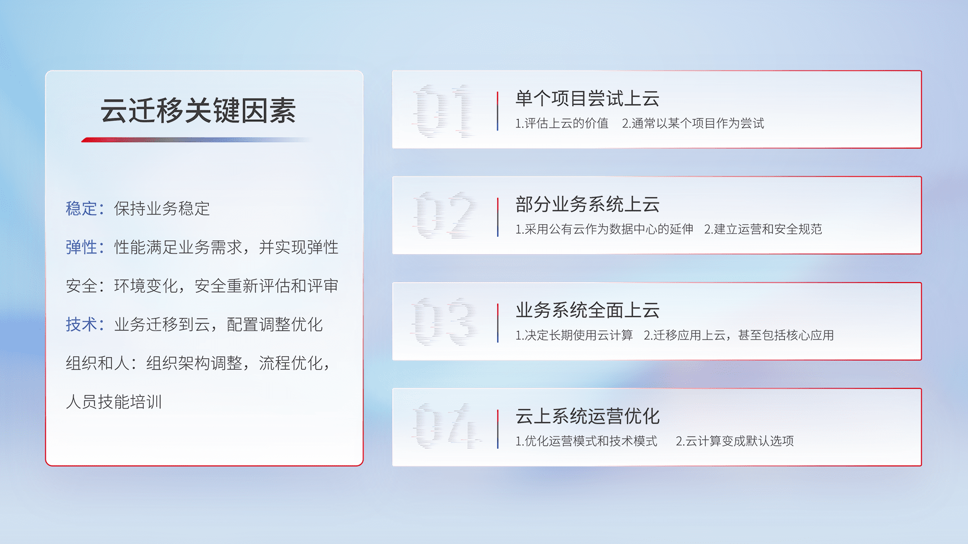 结合实际业务,,,从规划设计、、、、云平台选型、、、云原生改造、、、、数据迁移、、、、集成交付,,,迁移全过程为客户识别最佳上云路径,,,,做好风险识别管理,,,,设计网络架构、、、身份权限、、、、安全审计合规、、、、操作审计、、、、日志审计、、、监控告警策略、、、多站点容灾设计等,,,对云上基础设施进行整体规划,,提升IT治理水平,,,以满足弹性、、、高可用、、高性能的需求。。