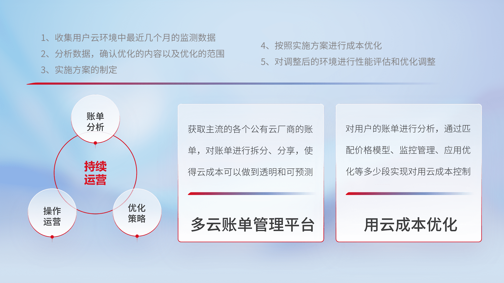 通过多云纳管,,,以统一的资源数据模型把客户的云资源进行抽象和封装,,进而实现对多云资源的统一操作,,保障云资源管理的可靠性、、、稳定性与可用性。。量身定制化运维内容,,,,配置、、开发运维、、、补丁管理、、备份、、、、监控、、认证和访问管理、、、、审计和日常巡检等,,,保障在用云过程中的可靠度,,稳定度以及高可用率。。