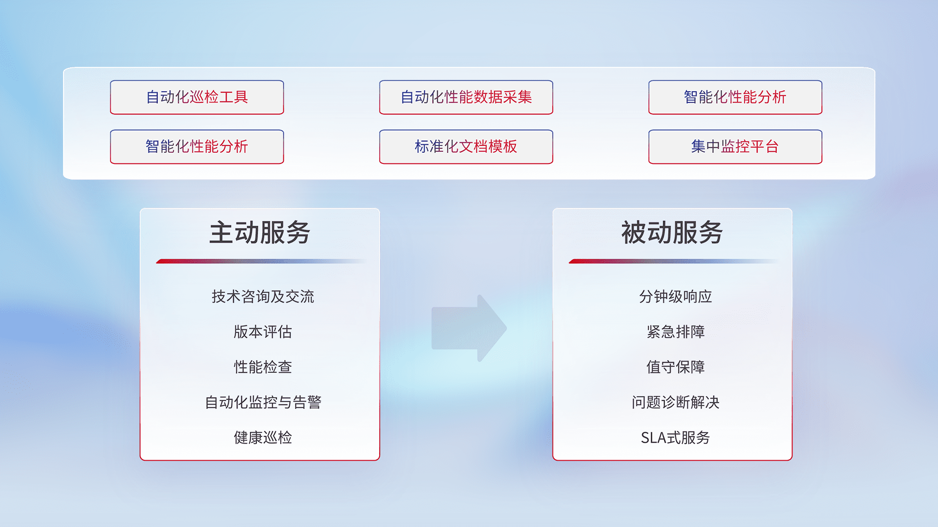 智能化工具和标准化文档,,保障服务质量,,,提供主动服务(包含技术咨询、、、版本评估、、、性能检查、、自动化监控与告警、、健康巡检)和被动服务包含(分钟级响应、、、、紧急排障、、、、值守保障、、、问题诊断解决、、、SLA服务)。。